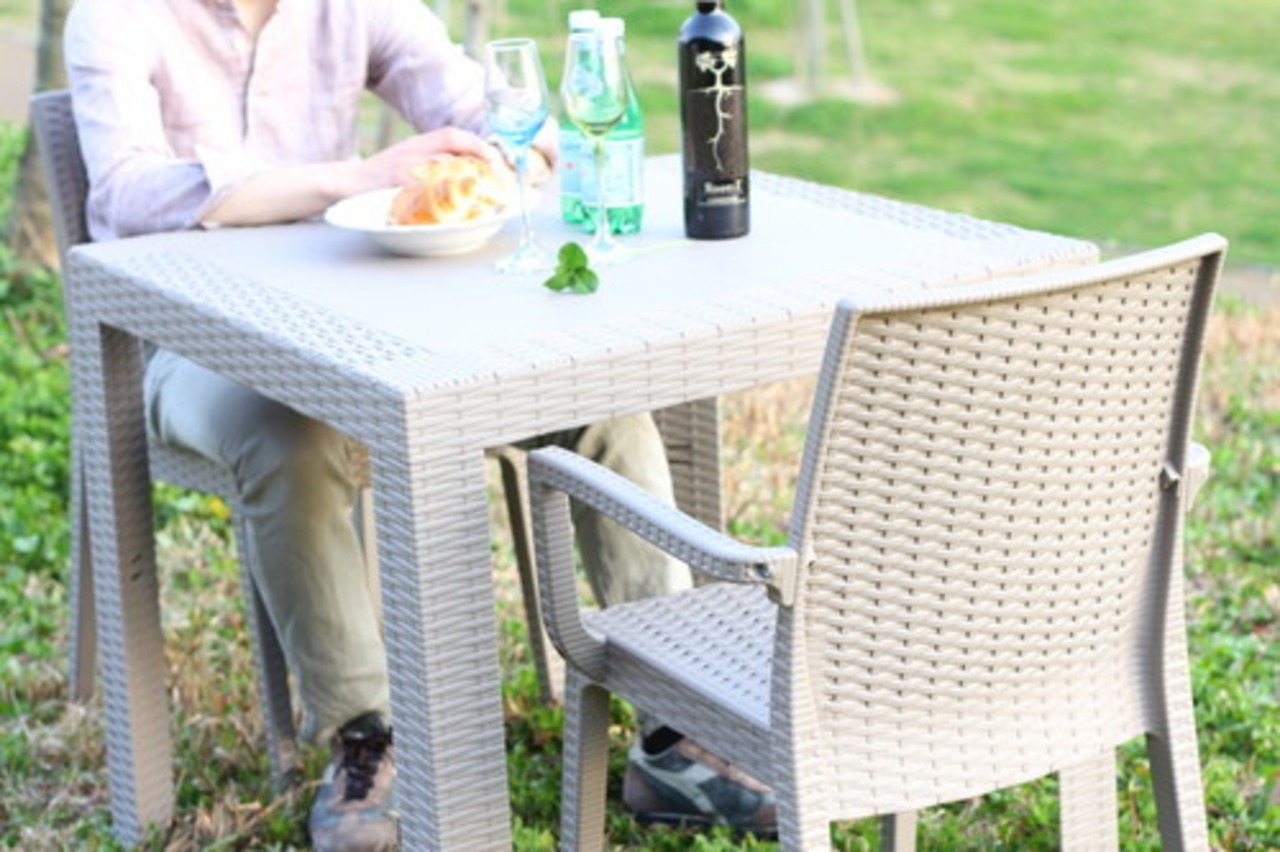 ラタンの風合いをプラスチックで再現したガーデンテーブルです。