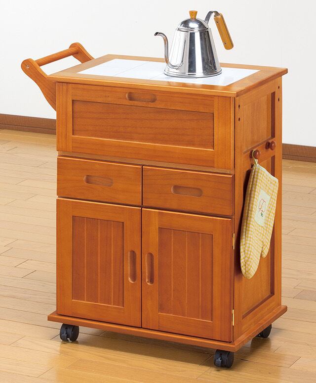 使い勝手の良いフラップ扉と小物をしまえる引き出し、大きな物をしまえる開き扉と収納力があるワゴンです。