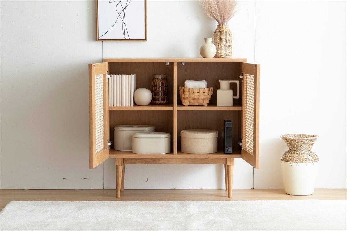 天然ラタンと美しい木目調を使用した、上質さ溢れる『Komero(コメロ)』ラタンキャビネット