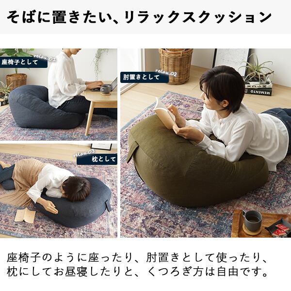 座椅子にように座ったり、肘置きとして使ったり、枕にしておお昼寝したりとくつろぎ方は自由です。