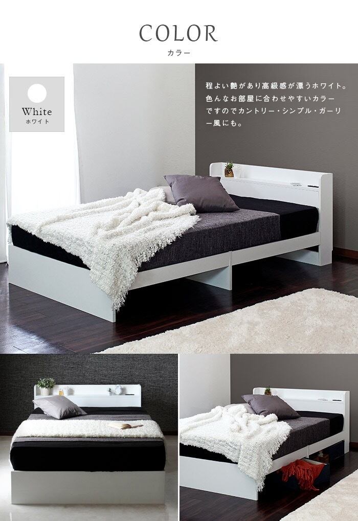 シンプルに見えても機能は豊富! ヘッドボードに棚があり、スマホやメガネ、目覚まし時計などのいつも使い小物を手元に置けます。
