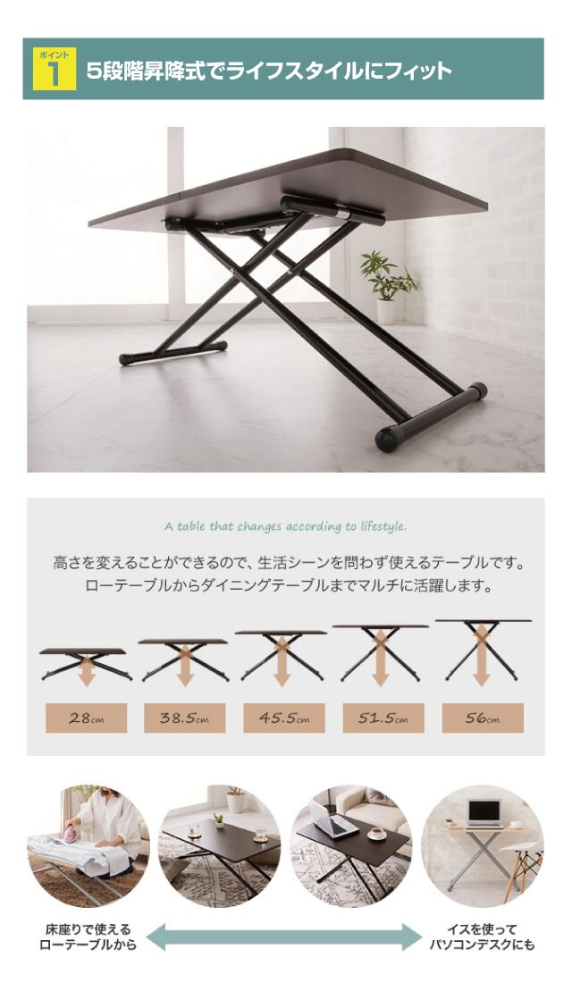 ●高さ5段階の調節が可能なので、低くして座卓、高くして作業台など色々な用途に活用できます。